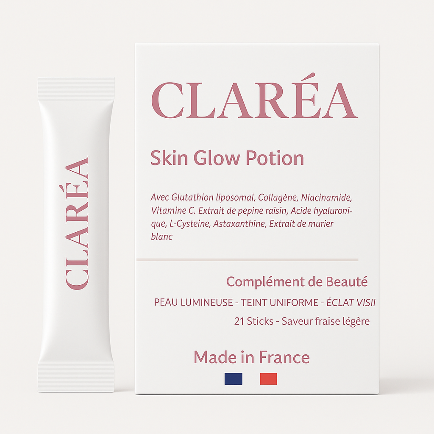 Nous avons développé un stick à biodisponibilité maximale, concentré en actifs rigoureusement dosés, hautement assimilables et cliniquement pertinents :Niacinamide pour l’éclat et l’uniformité du teint. Acide hyaluronique & L-Cystéine pour la fermeté, l’élasticité et le rebond Astaxanthine pour une puissante défense antioxydante. Dextrine résistante pour soutenir la gut-skin connection. Résultats visibles dès 21 jours – sans phase de purge, sans surcharge, et sans compromis sur la tolérance (500 volontaires). Une solution simple, ciblée, complète. Grâce à la vectorisation liposomale, chaque actif atteint précisément sa zone d’action. Un seul stick par jour. Goût fraise légère. Pas de surdosage. Pas de complexité.Chez Claréa, nous ne formulons pas des promesses. Nous concevons des protocoles de soin intégrés, ancrés dans la recherche, et conçus pour les vraies vies — et les vraies peaux.